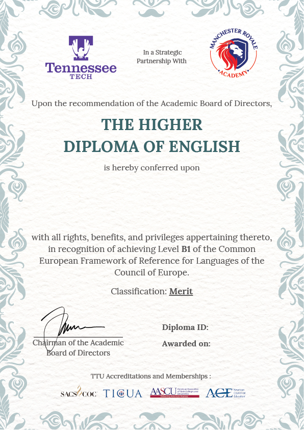 The Higher Diploma of English is an American-British diploma that combines a long history of English language teaching, methodology, and expertise from both sides of the Atlantic to offer a scientifically proven English language qualification. Graduates from the Higher Diploma of English will achieve a B1 level according to the CEFR standards set by Manchester Royale Academy.