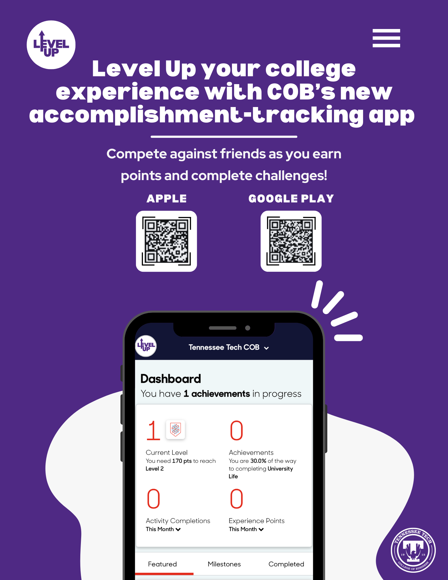 With each completed task, students will earn points to advance to the next level. Make your way up the leaderboard to win prizes and be featured on the Level Up board in the Foundation Hall lobby!