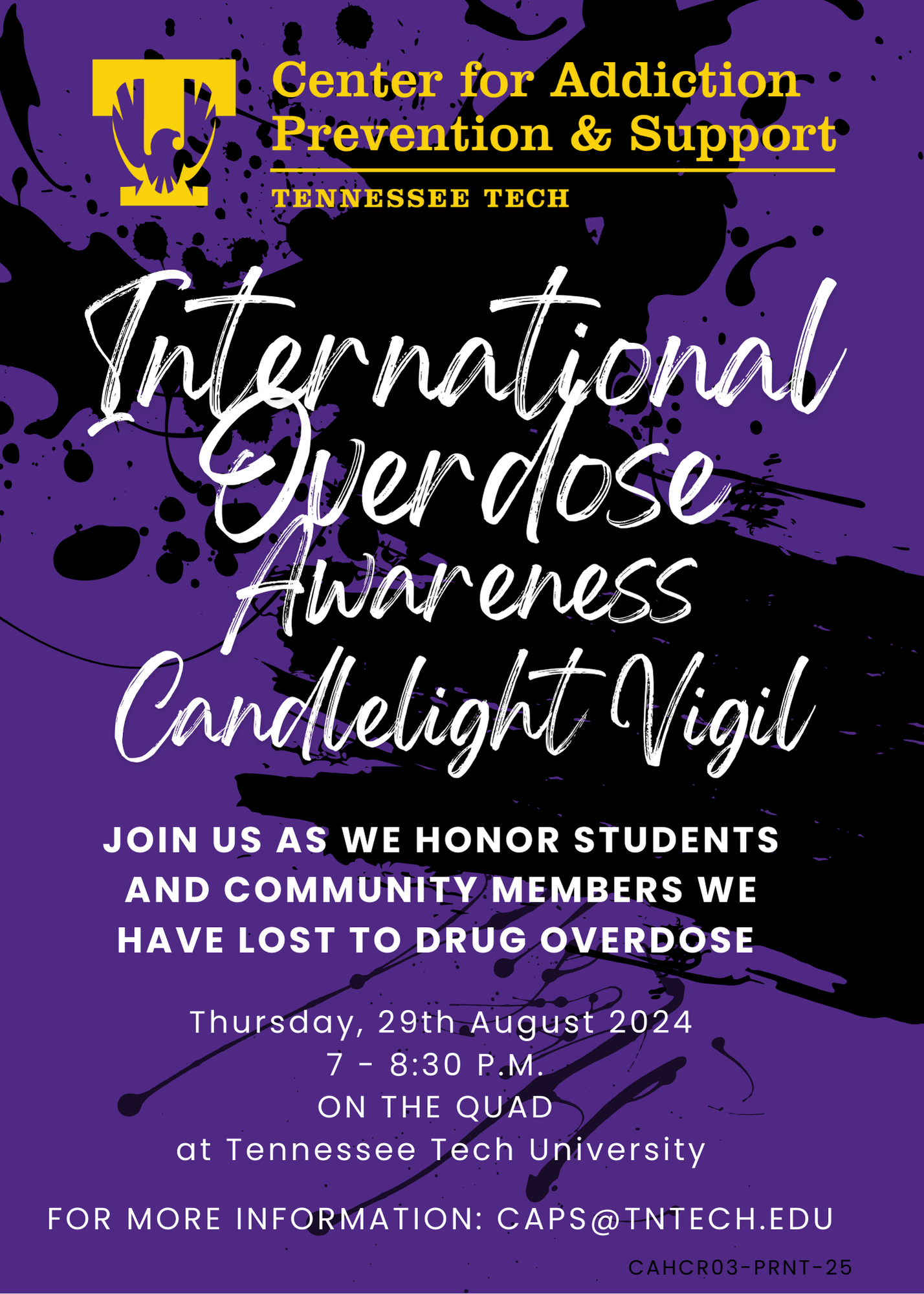 Join us as we honor students and community members we have lost to drug overdose on Thursday, August 29th, 2024 from 7 PM to 8:30 PM on the Quad at Tennessee Tech. For more information, email us at caps@tntech.edu!