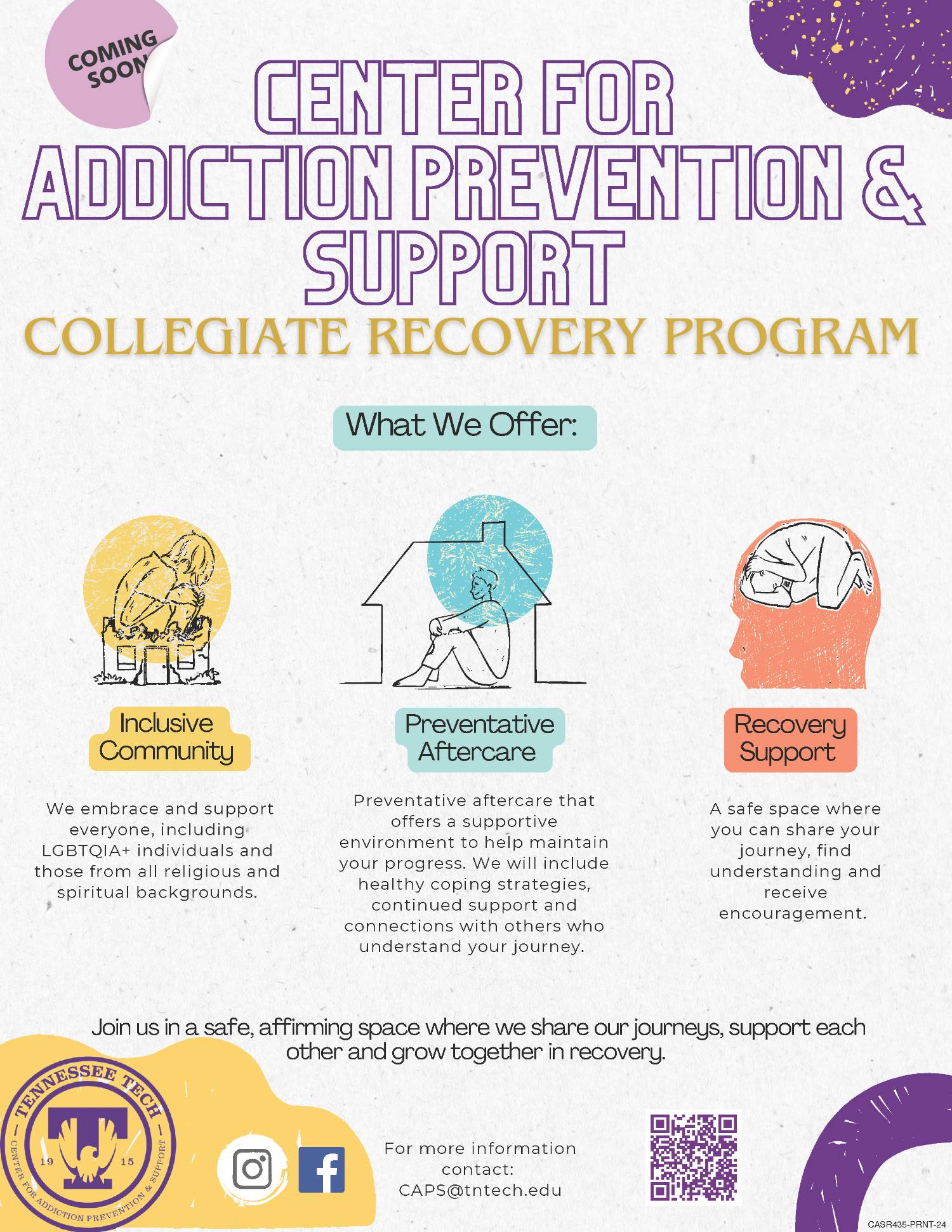 Join us in a safe, affirming space where we share our journeys, support each other and grow together in recovery. For more information, contact us at CAPS@tntech.edu.