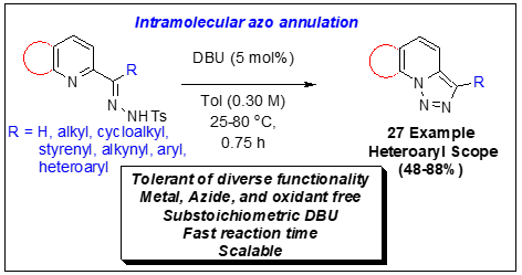 30. Edirin, O. J.; Carrick, J. D.* Synthesis of Fused [1,2,3]-Triazoloheteroarenes via Intramolecular Azo Annulation of N-Tosylhydrazones Catalyzed by 1,8-Diazabicyclo[5.4.0]undec-7-ene. Journal of Organic Chemistry 2024, 89, 7201–7209. View Article