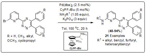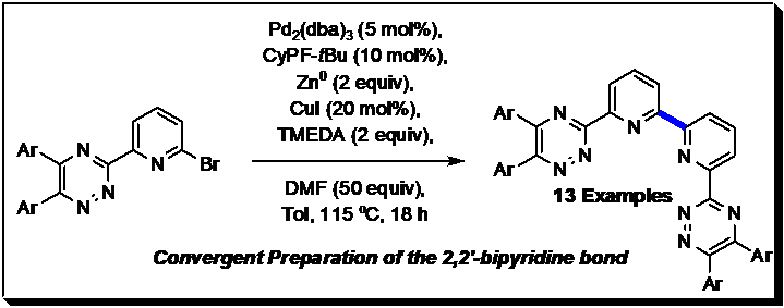 17. Waters, G. D.; Carrick, J. D. "Convergent access to bis-1,2,4-triazinyl-2,2’-bipyridines (BTBPs) and 2,2’-bipyridines via a Pd-catalyzed Ullman-type reaction." RSC Advances 2020, 10, 10807–10815. View Article
