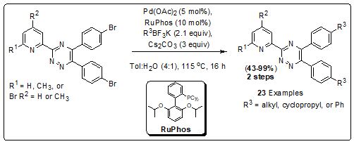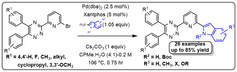 15. Gulledge, Z. Z.; Tedder, M. L.; Lyons, K. R.; Carrick, J. D.* Synthesis of tridentate indolyl pyridinyl [1,2,4] triazine Lewis basic complexants via Pd-catalyzed Suzuki-Miyaura cross-coupling. ACS Omega, 2019, 4, 18855–18866. View Article