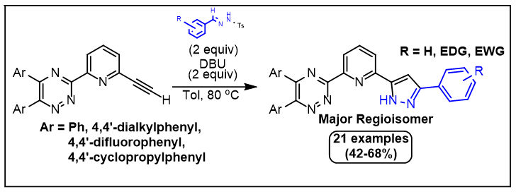 14. Veerakanellore, G. B.; Smith, C. M.; Vasiliu, M.; Oliver, A. G.; Dixon, D. A.; Carrick, J. D.* Synthesis of 1H-pyrazol-5-yl-pyridin-2-yl-[1,2,4]triazinyl soft-Lewis basic complexants via metal and oxidant free [3+2] dipolar cycloaddition of terminal ethynyl pyridines with tosylhydrazides. Journal of Organic Chemistry 2019, 84, 14558–14570. View Article