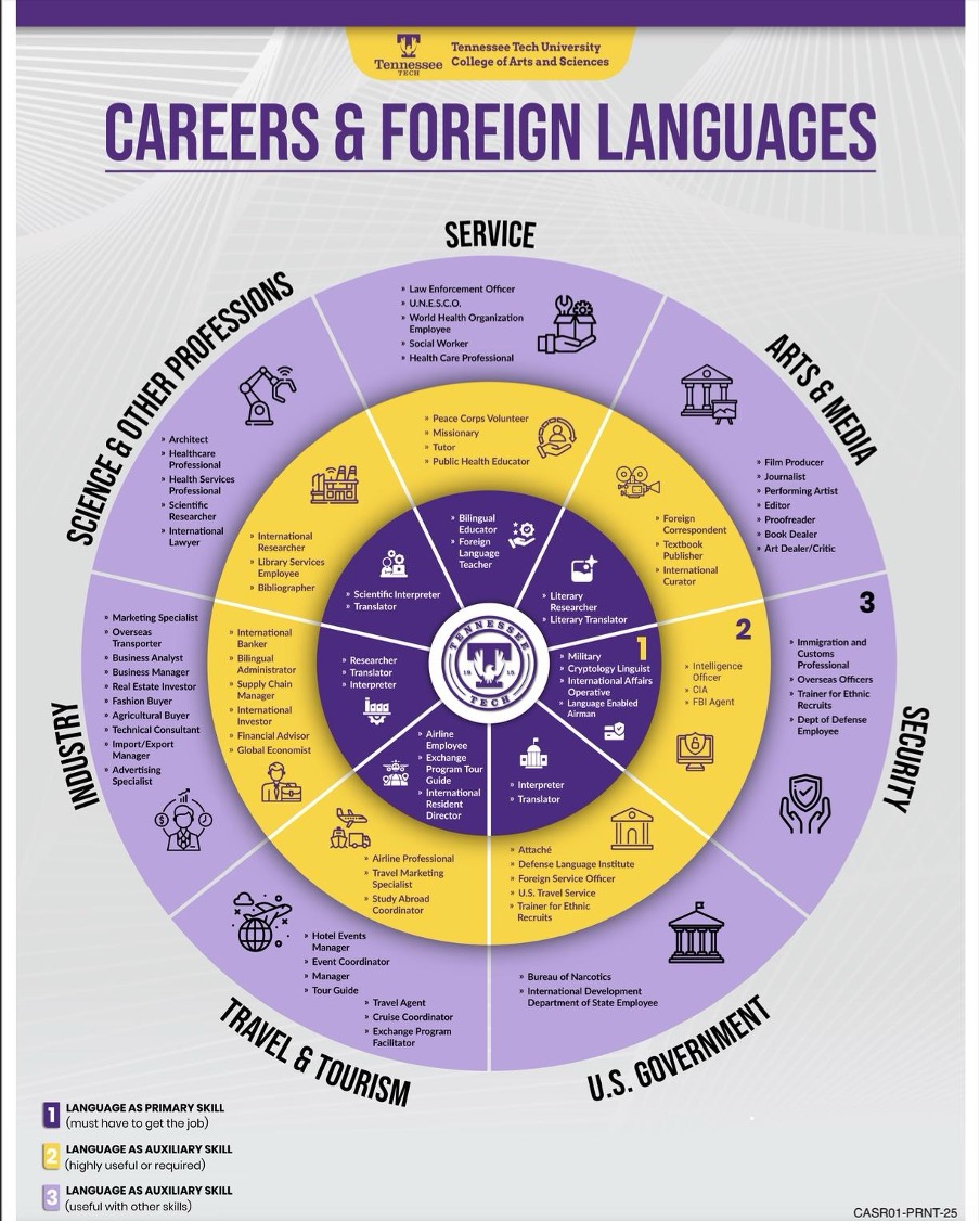 *Keep in mind that some of these professions require additional undergraduate or graduate work or degrees. Contact us for more details and suggestions on using your love of languages after graduation.