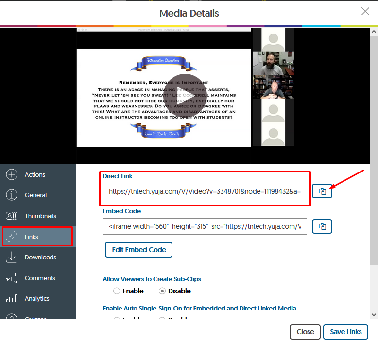 Would you like to allow someone to view your link that is not in a class or even associated with Tennessee Tech? You can get a direct link to any video to send to someone.