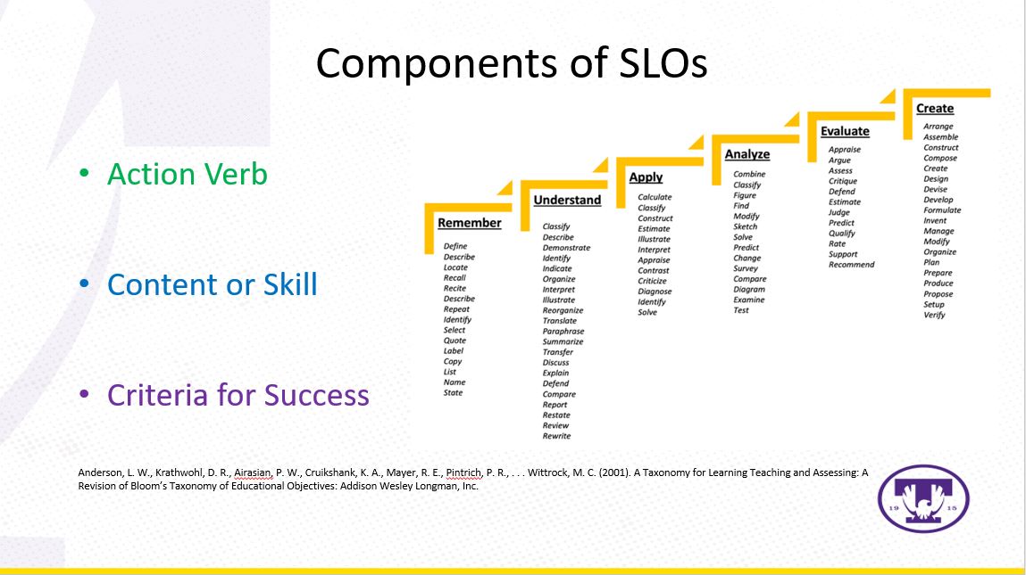 Action verbs are critical components of SLOs because they describe the observable behavior or action that the student will demonstrate. Effective action verbs are specific, measurable, and generally focus on higher-order thinking skills. Taxonomies of educational objectives can be used as a guide for developing SLOs. The most well known educational objective taxonomy is Bloom’s Taxonomy of Educational Objectives (1956). Levels of performance in this taxonomy include knowledge, comprehension, application, analysis, synthesis, and evaluation. There are also other popular taxonomies which include Bloom’s Revised Taxonomy (2001), the Taxonomy of Significant Learning (Fink, 2013), Dimensions of Learning (Marzano, Pickering, & McTighe, 1993), and Taxonomy of Educational Objectives (Marzano & Kendall, 2008).