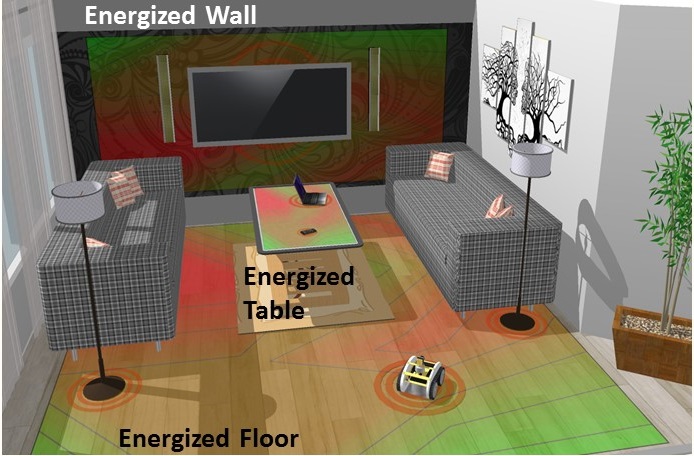 For indoor applications, common surfaces may be energized and act as an electrical “plug”. Robotic devices may be operated over these surfaces without the need of a battery, granting them unlimited operation with control signals simultaneously sent on the surface.
