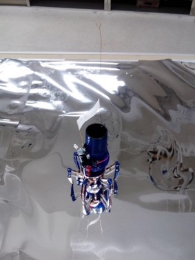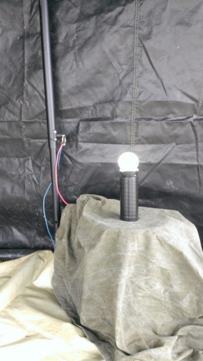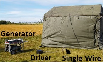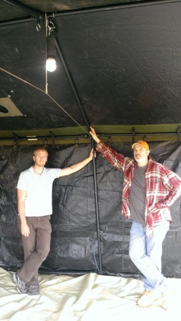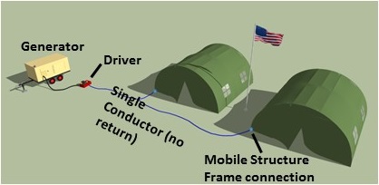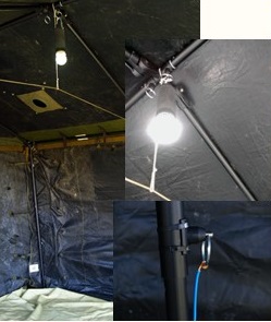 A single connection to the frame allows power to any location on the frame. This eliminates the need to for bulky wiring. Power can be extended from the frame to other objects to deliver power. Here (right) power is delivered to a lamp using a metal bucket covered with fabric. Only a single connection (red wire) is needed between the tent frame and bucket.