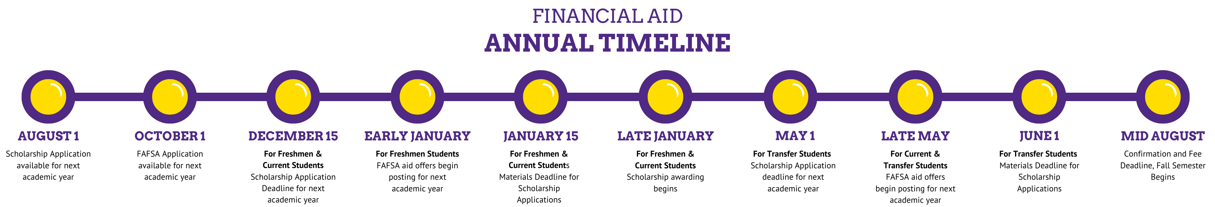 Paying for college may seem intimidating, but don't worry, our team is here to help you get started! Available financial aid options vary depending on your student status. Choose your status below to view a tailored list of Financial Aid options, and check out the Financial Aid Annual Timeline below for a list of important financial aid dates. If you have any questions about your financial aid timeline, contact us for assistance!