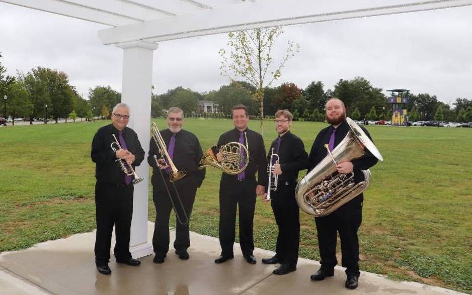 Brass Arts Quintet faculty members (L-R)- Cassandra McDonald, trumpet, Justin Stanley, horn, Preston Light, tuba, Joshua Hauser, trombone, and Chris McCormick, trumpet.