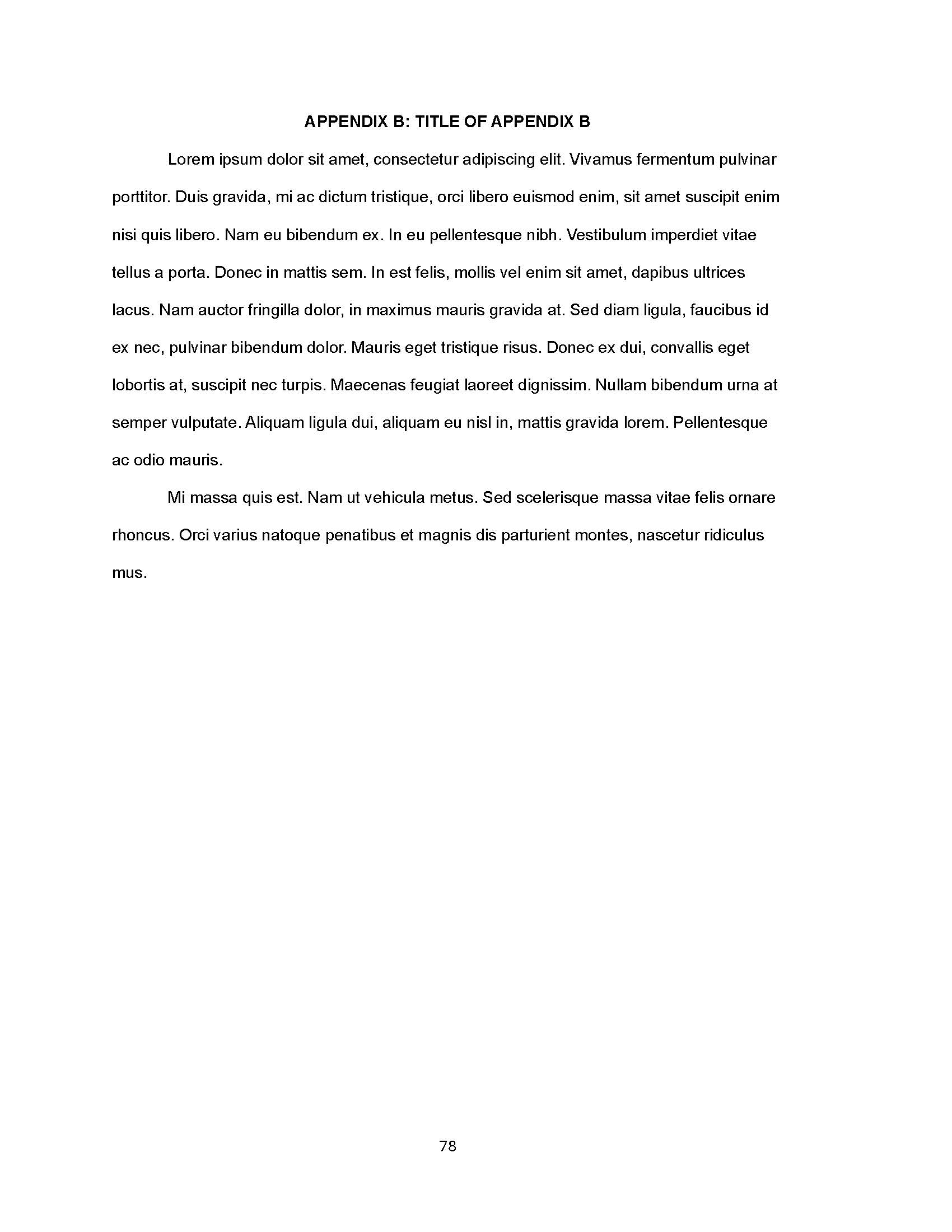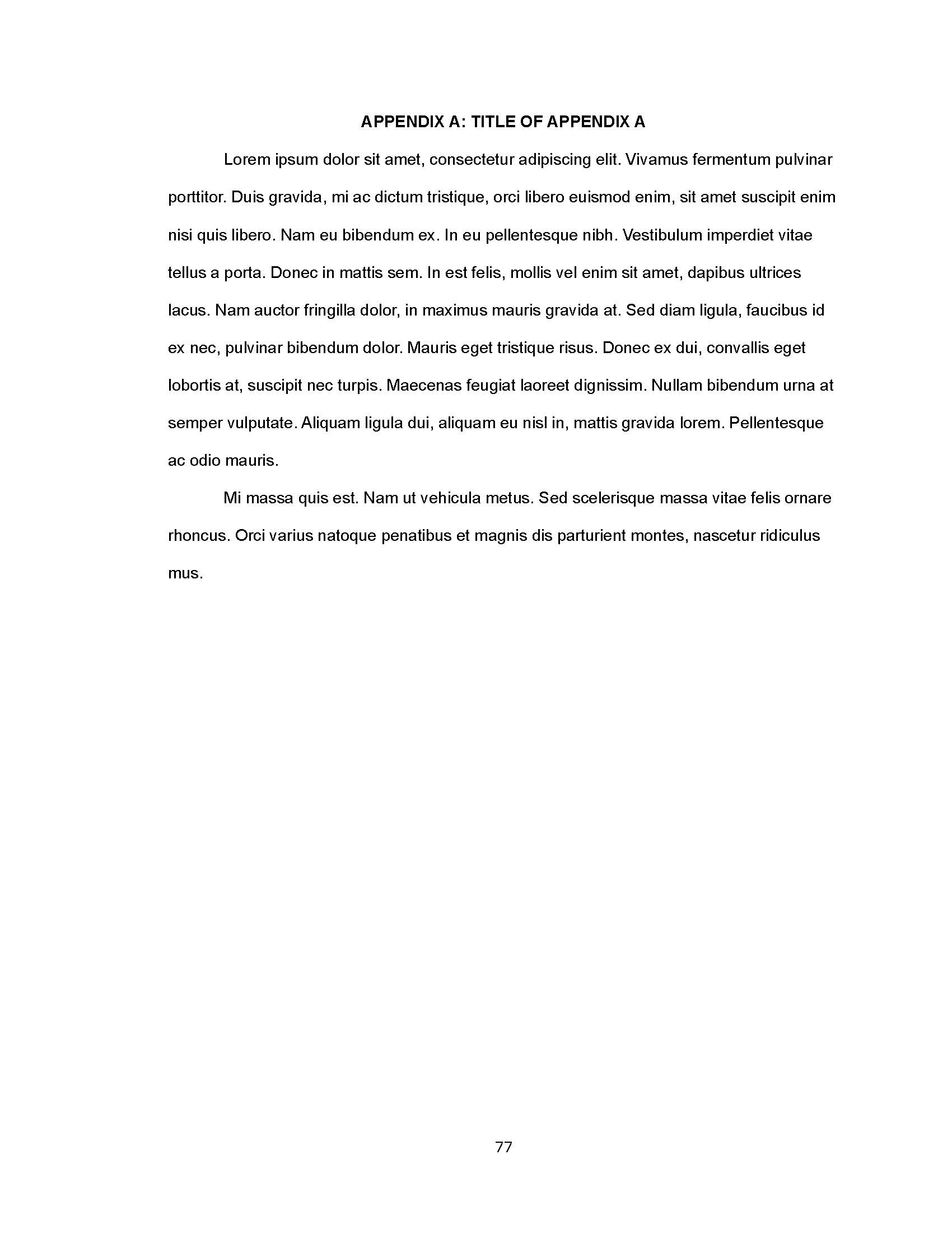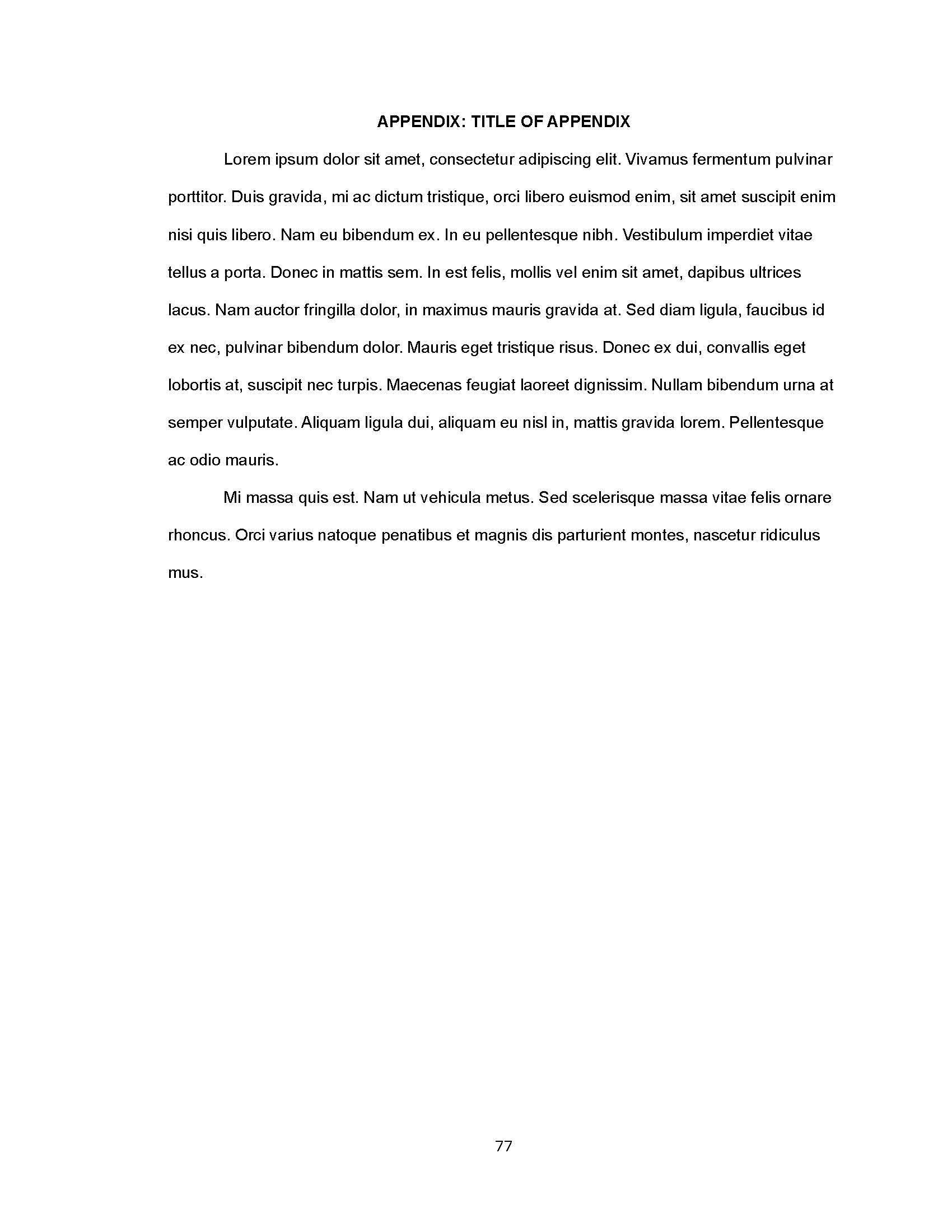 Type the title of the appendix on the top line (in all caps). If you only have one appendix, label it APPENDIX: TITLE OF APPENDIX (all caps option) or Appendix: Title of Appendix (title case option). If you have more than one appendix, your appendices will be labeled sequentially starting at A and continuing with B, C, etc. (e.g., APPENDIX A: TITLE OF APPENDIX). Be sure to label this title as a page title heading to format it properly; see Content/Chapters for more information about headings.