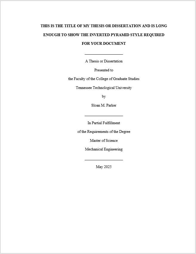 - At the top, enter your title. The title should be centered and bold, and it can be in all caps (TITLE OF YOUR THESIS/DISSERTATION) or title case (Title of Your Thesis/Dissertation). Your title must also form an upside down triangle if it is more than one line. This means the first line is the longest and each consecutive line is shorter than the previous line.