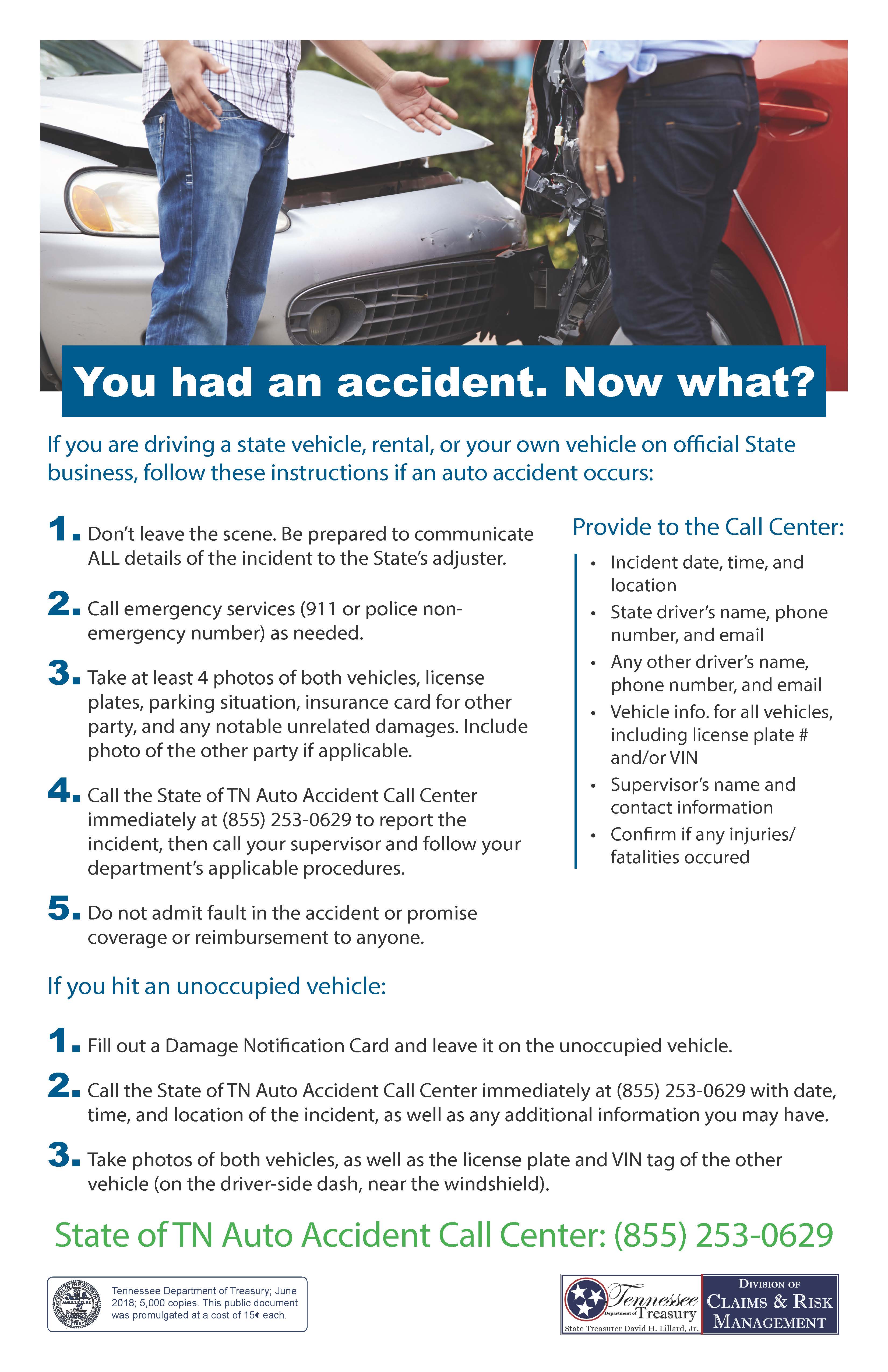 - Call the State of TN Auto Accident Call Center immediately at (855) 253-0629 to report the incident, then call your supervisor and follow your department's applicable procedures.