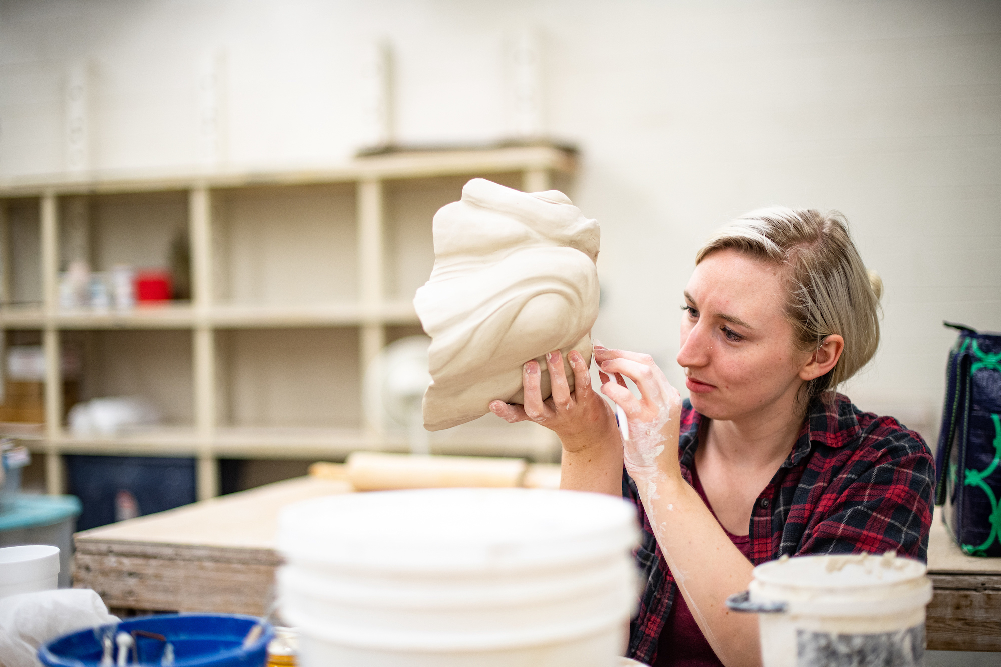 The Bachelor of Fine Arts concentration in clay is designed to prepare the student to become a fine artist. The integration of studio and lecture courses in the curriculum as well as activities and enrichment opportunities encourages the skills and concepts essential to the student’s growth as an artist. The clay program emphasizes a strong foundation in materials and techniques, broad competency in firing processes and operation of studio equipment, development of personal artistic style and direction, and a thorough exploration of historical and contemporary ceramic traditions. The clay curriculum includes classes in hand building, throwing, surface design, ceramic history, ceramic chemistry, and kilns/firing theory.