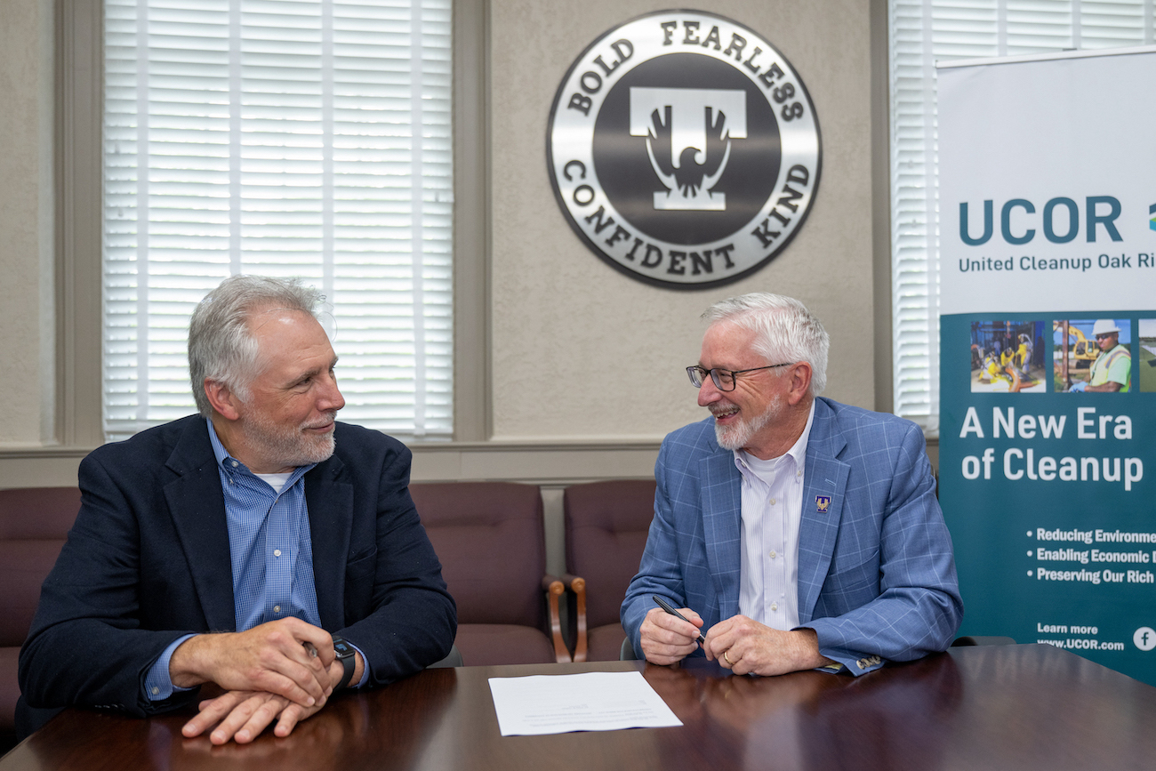 From left: UCOR President and CEO Ken Rueter and Tech President Phil Oldham sign a