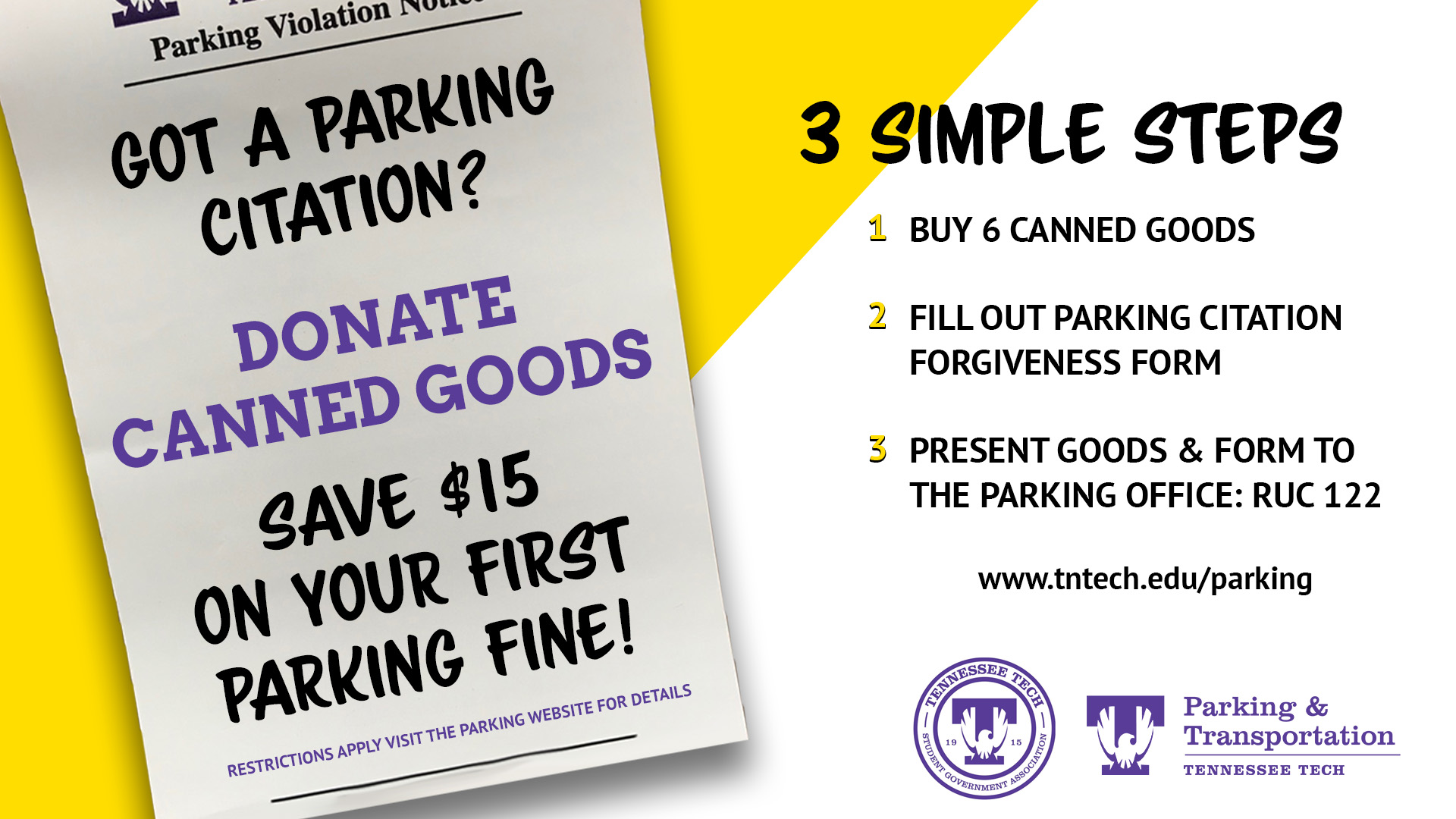 Each student can utilize this donation opportunity once per semester. Donations must be made within 15 business days of the citation date; any donations beyond this period will not be accepted. Furthermore, only citations that have not yet undergone the appeals process are eligible for forgiveness through food donations.