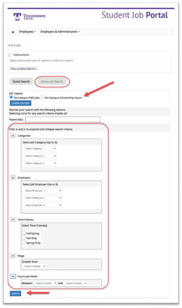 - Search by Job Type (On-Campus FWS or On-Campus Scholarship Hours)