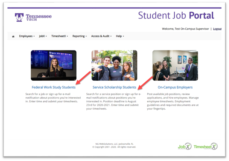 Then click on the ‘Federal Work Study Students’ or ‘Service Scholarship Students' link to access the area of your choice.