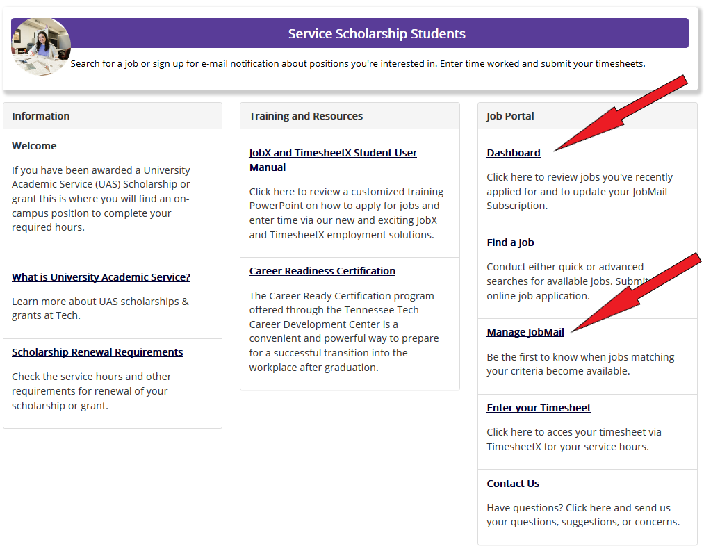 Beginning in the Fall 2020 semester, University Academic Service scholarship students will find, apply for, and accept UAS jobs in the JobX Student Job Portal. Completion of hours will be entered, approved, and tracked in the same system, accessed through the central single-sign-on system. The Federal Work Study program will also use the same Student Job Portal.