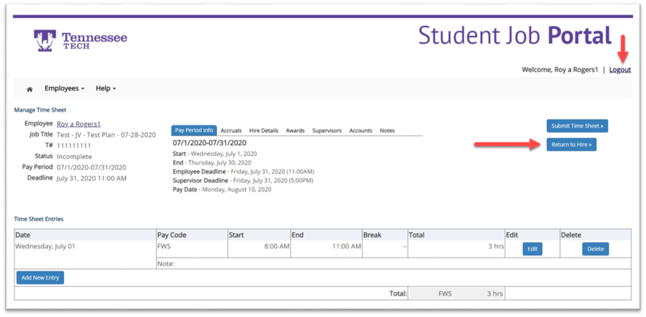 If you’re finished entering time worked, click ‘Return to Hire’ to return to your list of job(s).