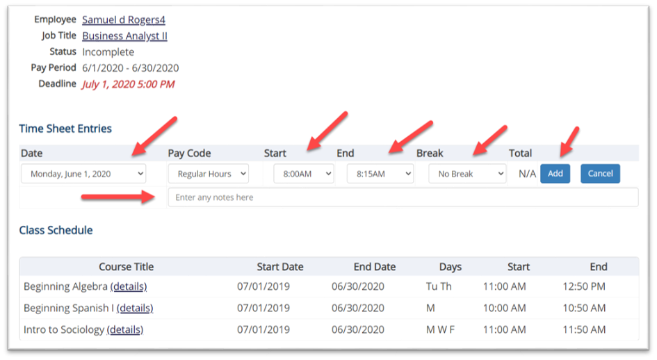 - Job Category, Employers/Department, Time Frame, and Hours per Week
